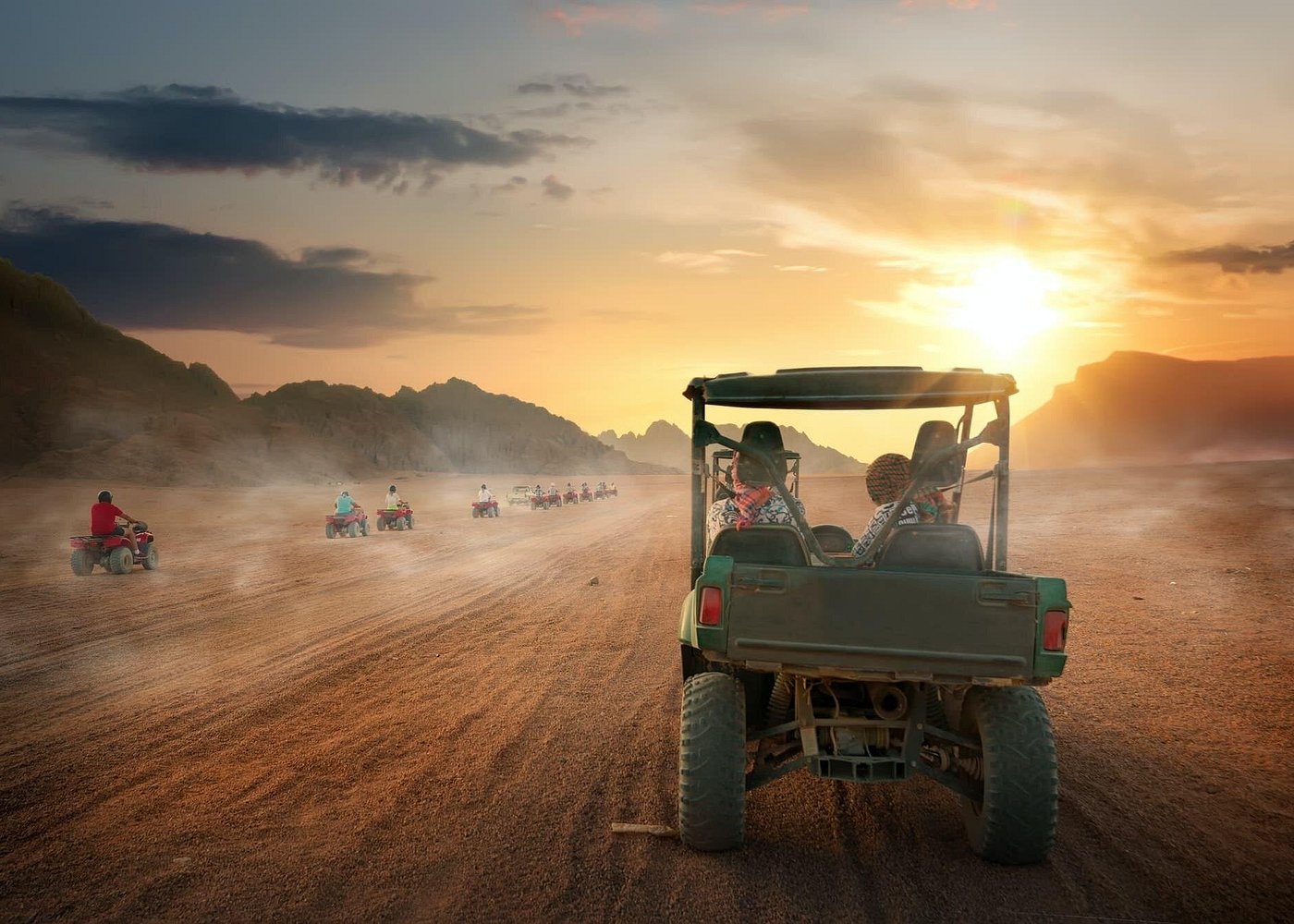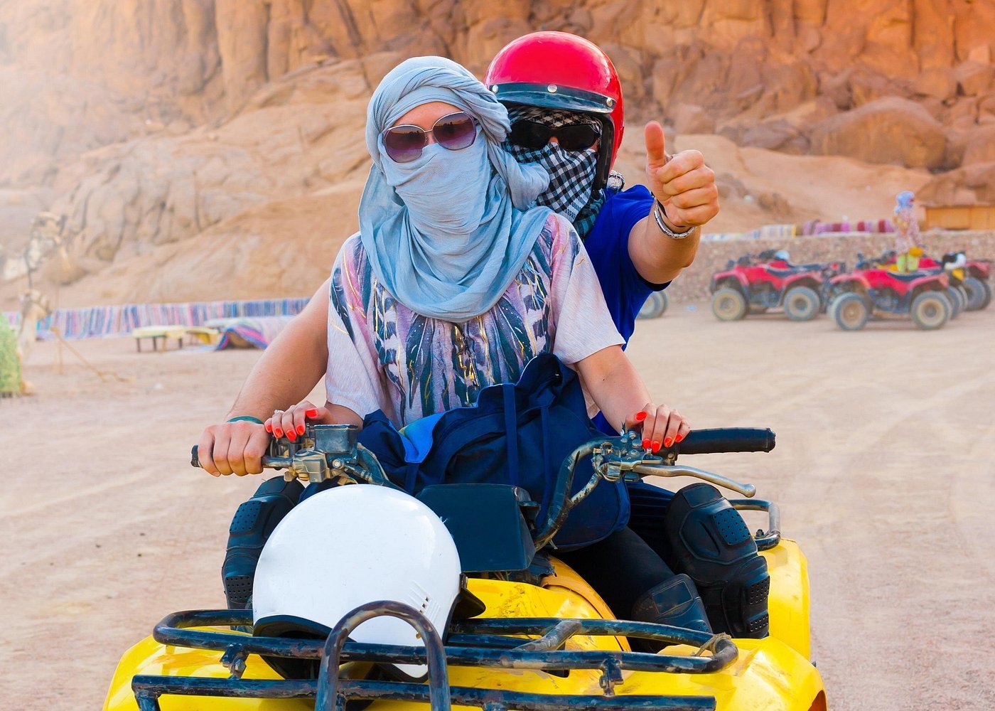 Your adventure leads to a genuine Bedouin village. Here, you'll be welcomed with refreshing herbal tea and have the chance to explore the culture and traditions of the desert people. Enhance your immersion with a tranquil camel ride, viewing the landscape from a new perspective. Finally, rev up your quad for an exhilarating return ride through the vast desert.